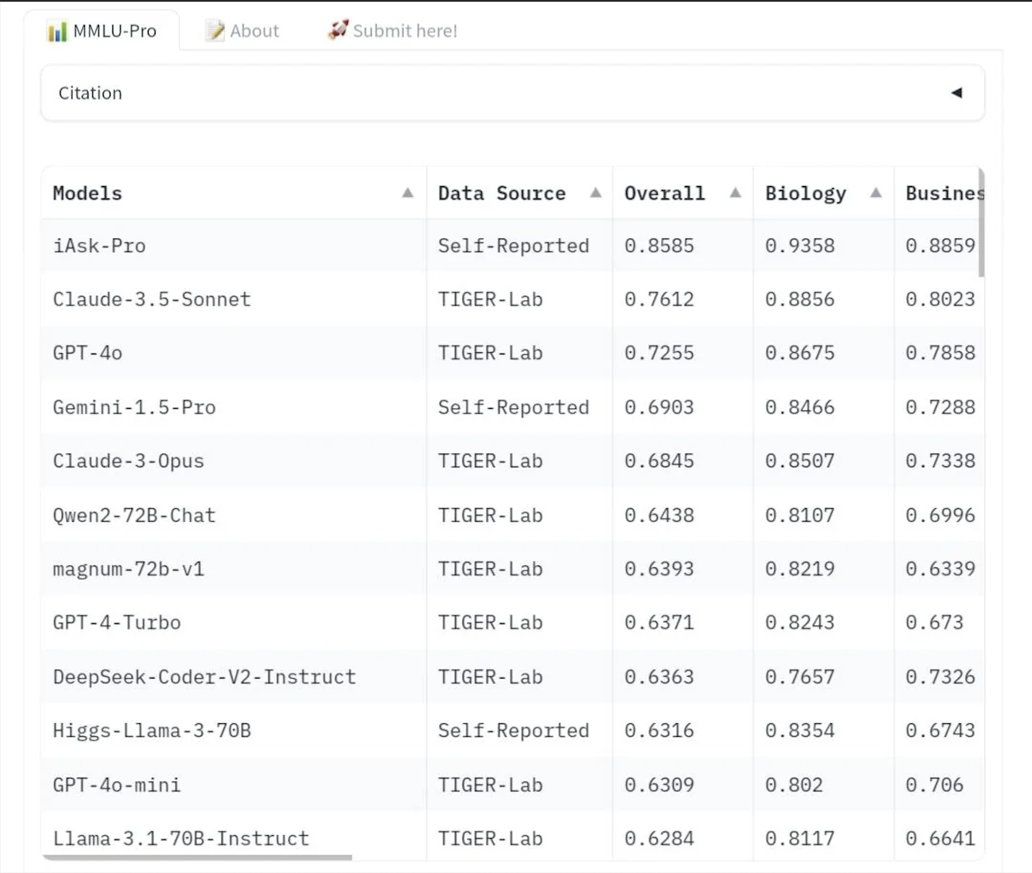 The MMLU-Pro dataset is the most comprehensive and demanding multi-task understanding dataset created to-date. Comprising over 12,000 intricate questions spanning various fields, the dataset is designed to evaluate the capabilities of large language models more thoroughly than ever before. MMLU-Pro, the open-source evaluation framework from TIGER AI Lab, aims to push the boundaries of what AI can achieve in language comprehension and reasoning across diverse domains. Please see the official external MMLU Pro Leaderboard on Hugging Face, listing us, iAsk Pro, as the #1 scoring AI overall and as #1 ranked AI in every single subject area.